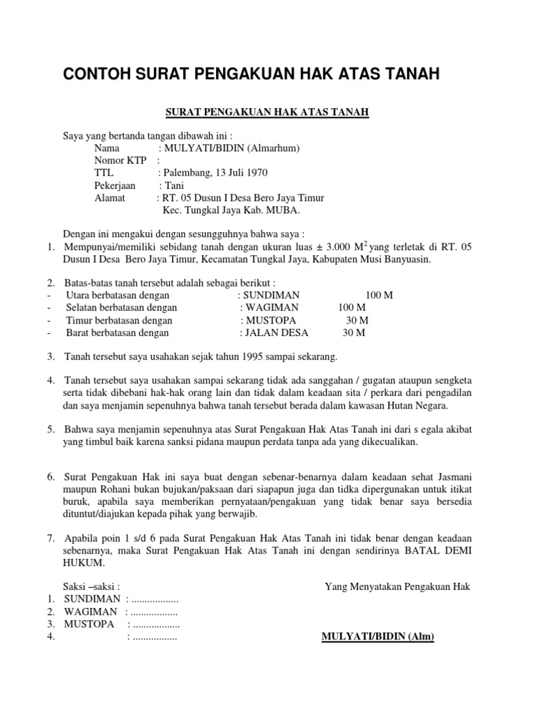 Contoh Surat Pengakuan Hak Atas Tanah Pdf